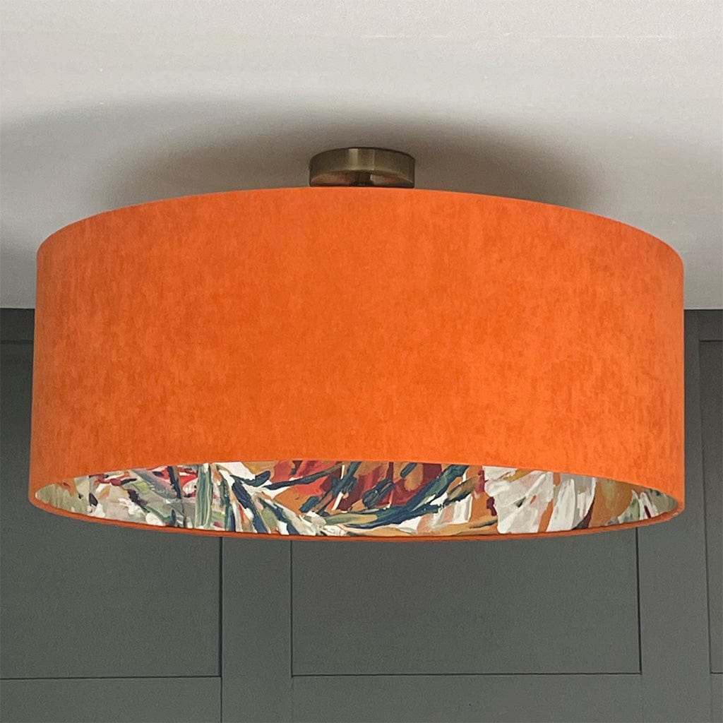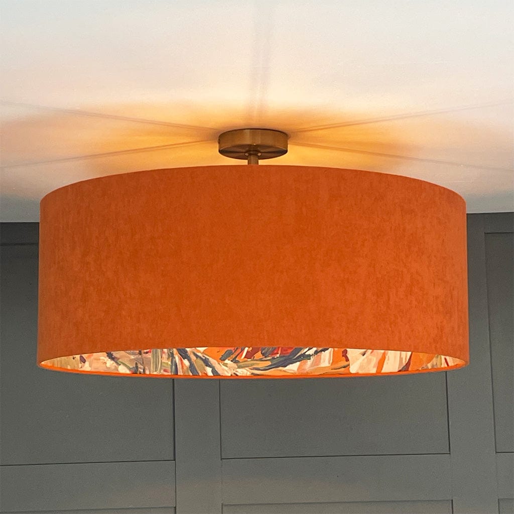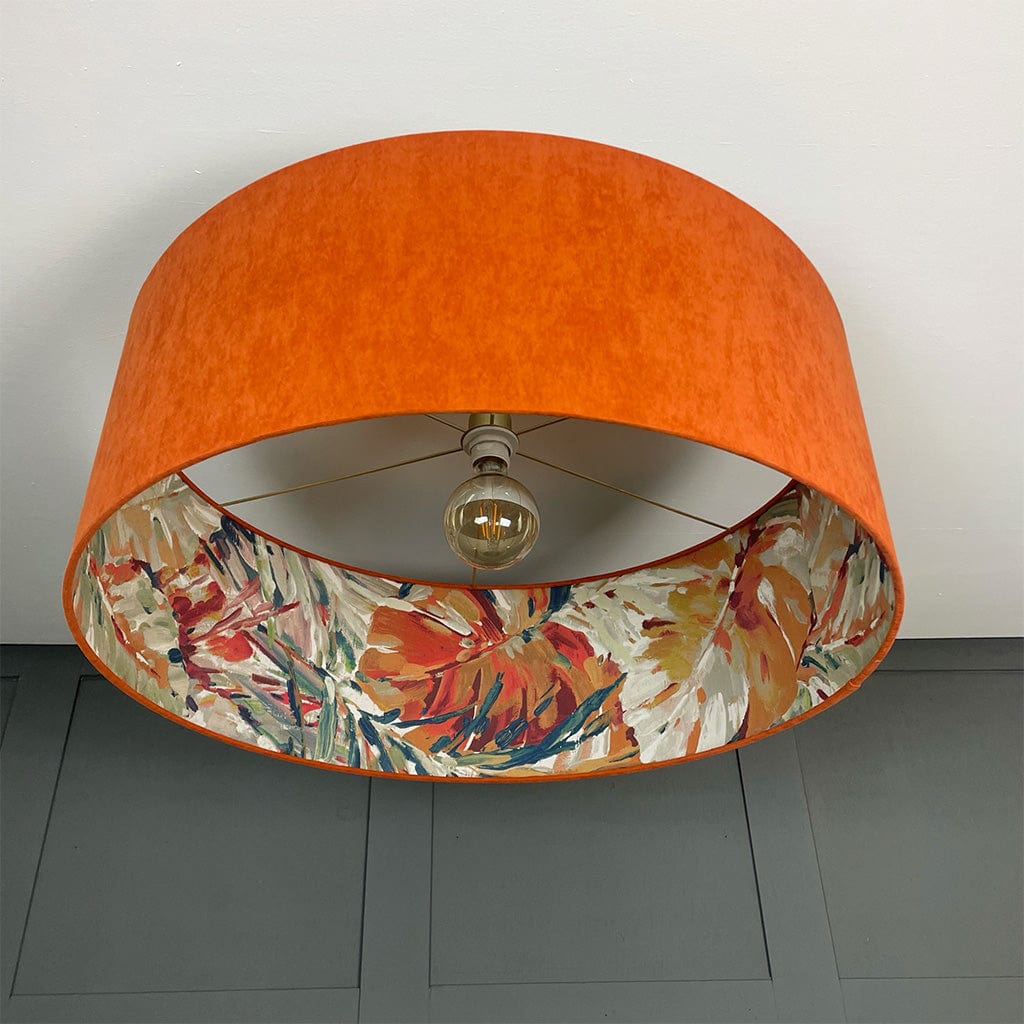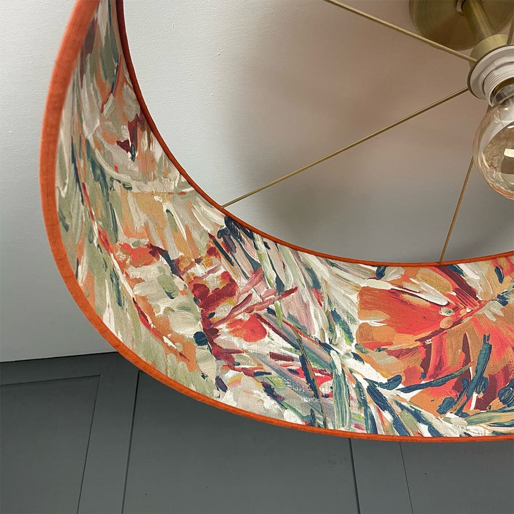 This Rocke shallow drum shade with a Palmyra Spice fabric is statement worthy. Summer jewel tones dance on the interior of this shade in a painterly fashion, each stroke filled with life and activity. Paired here with a burnt orange, recycled fabric outer to give an extra boost of radiance from within making the teals, oranges and pastel tones on the outer feel tropical.
