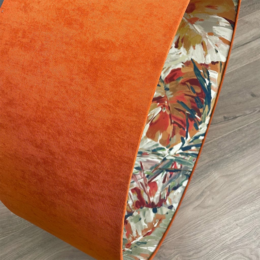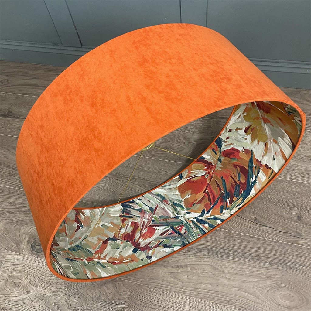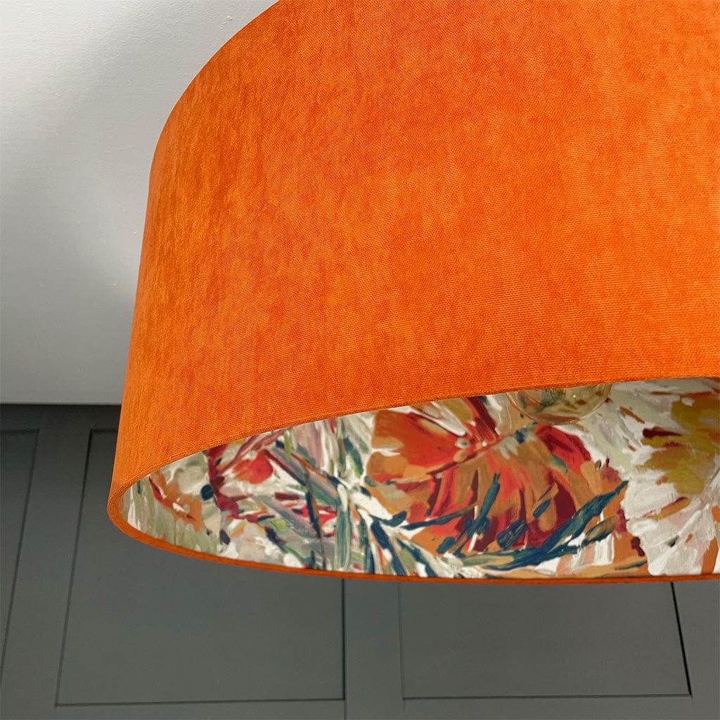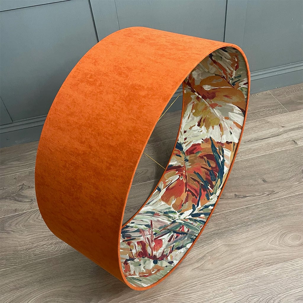 This Rocke shallow drum shade with a Palmyra Spice fabric is statement worthy. Summer jewel tones dance on the interior of this shade in a painterly fashion, each stroke filled with life and activity. Paired here with a burnt orange, recycled fabric outer to give an extra boost of radiance from within making the teals, oranges and pastel tones on the outer feel tropical.