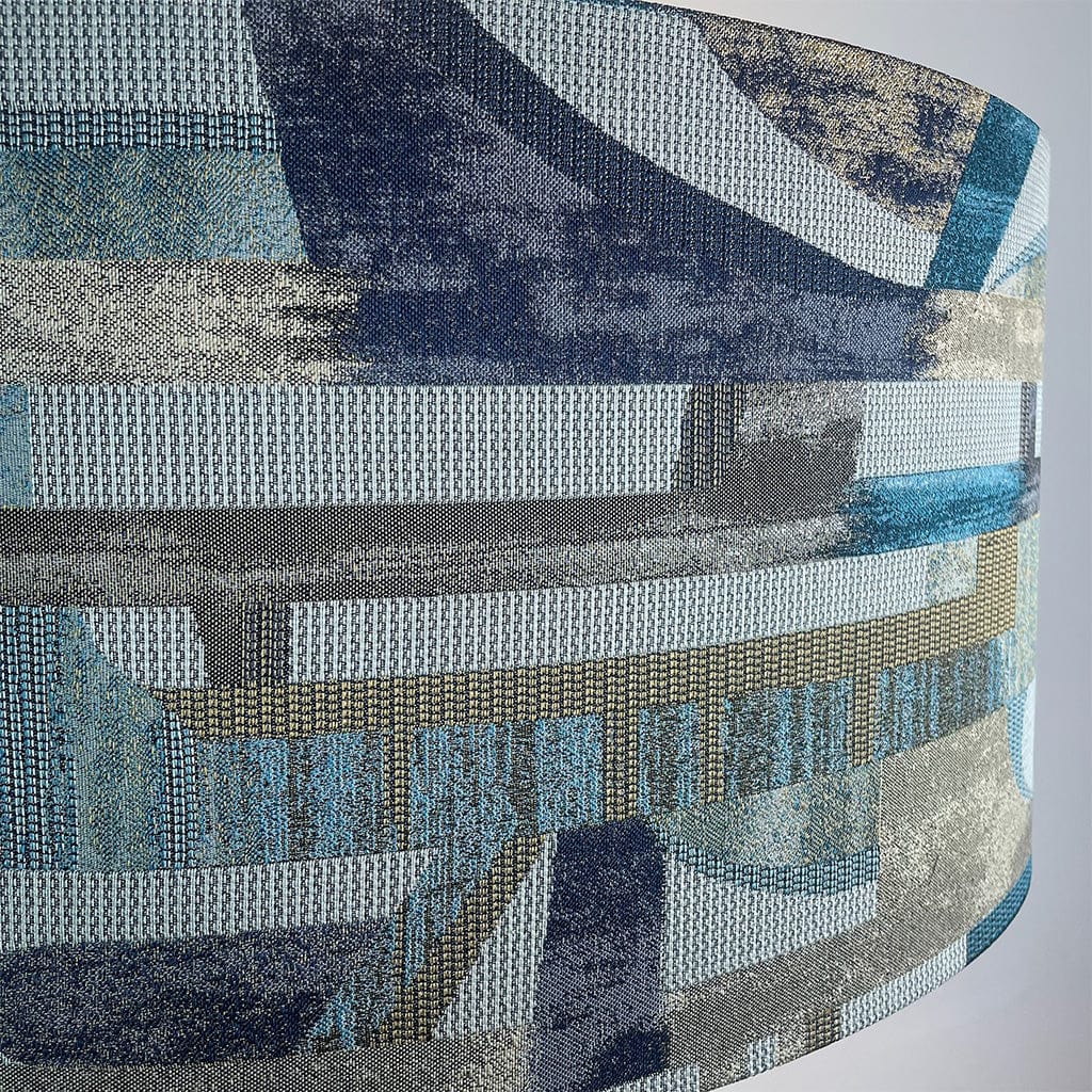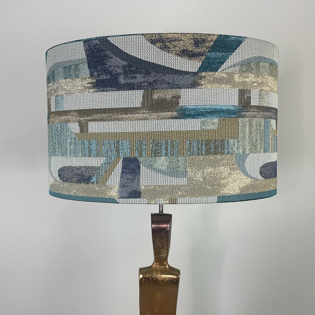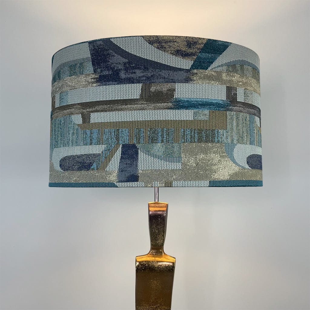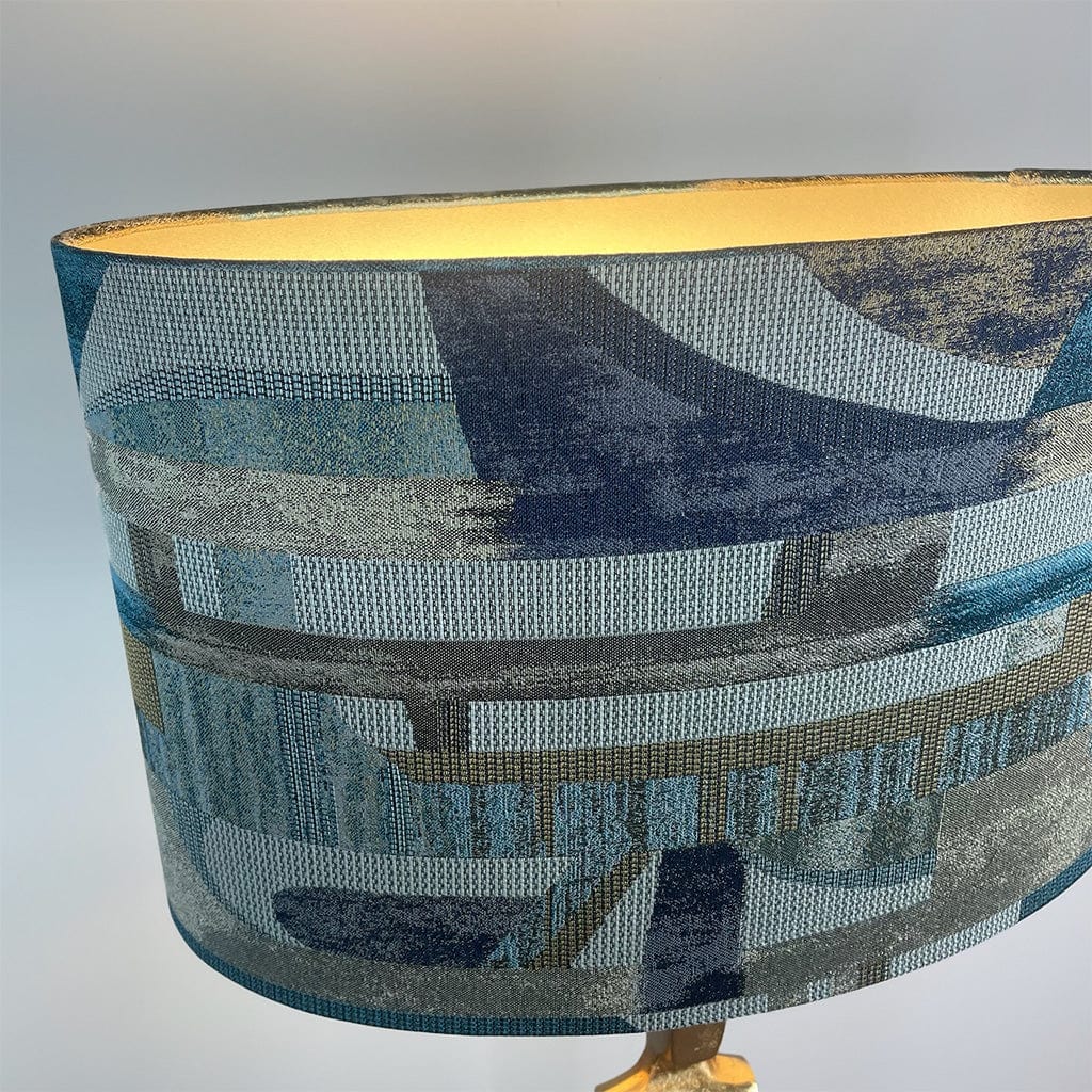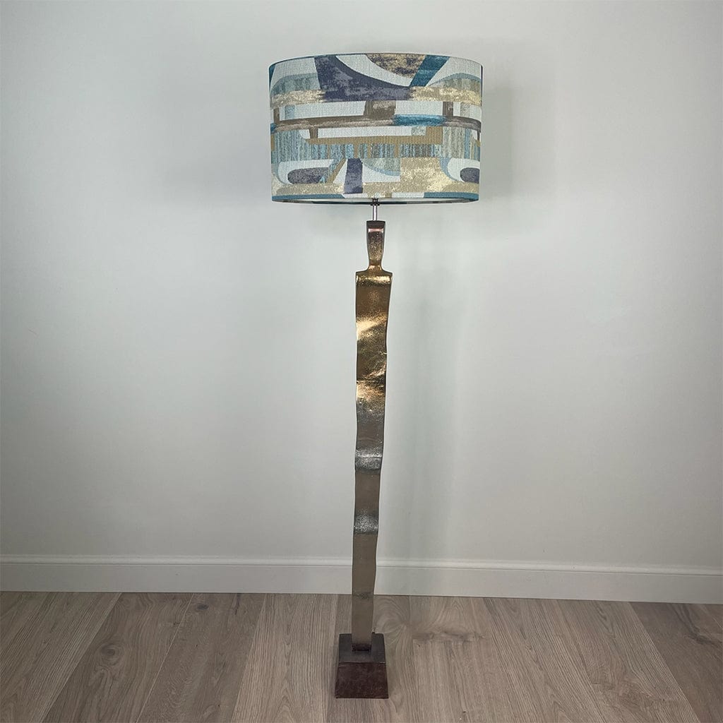 The warm copper and bronze tones of the ombre metallic finish on our Totem floor lamp are picked out and echoed in this champagne lined large oval lampshade covered in Berlin fabric with teal.