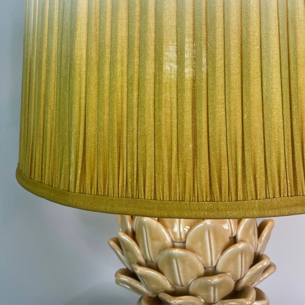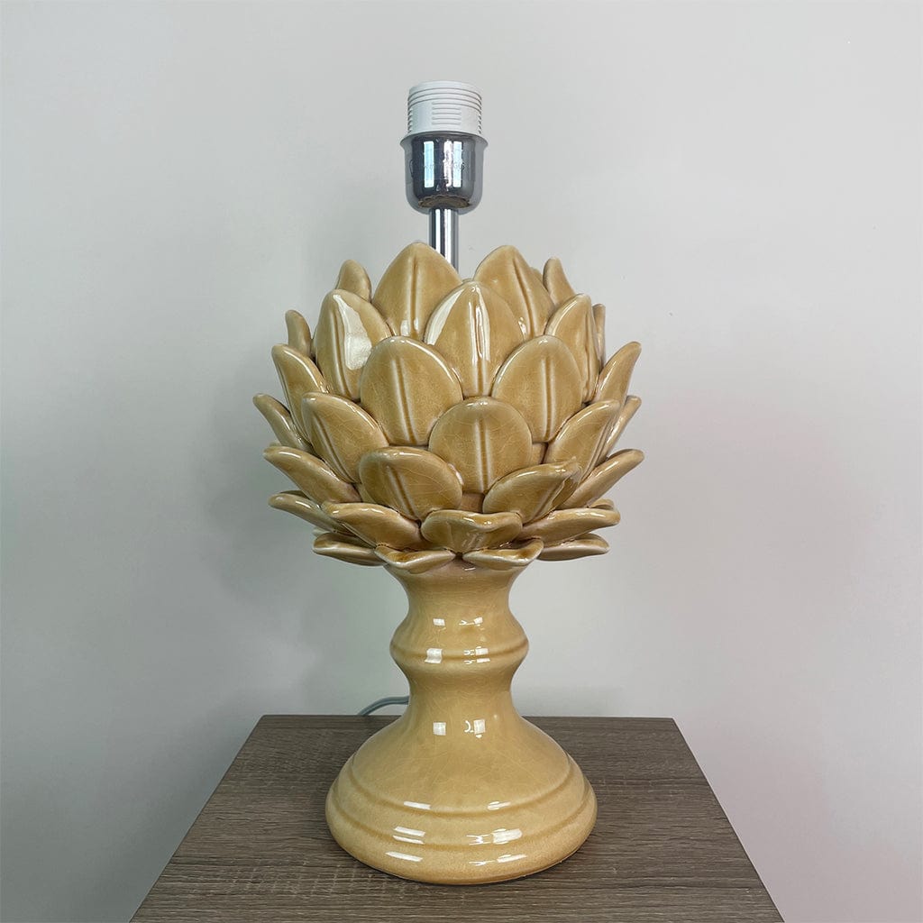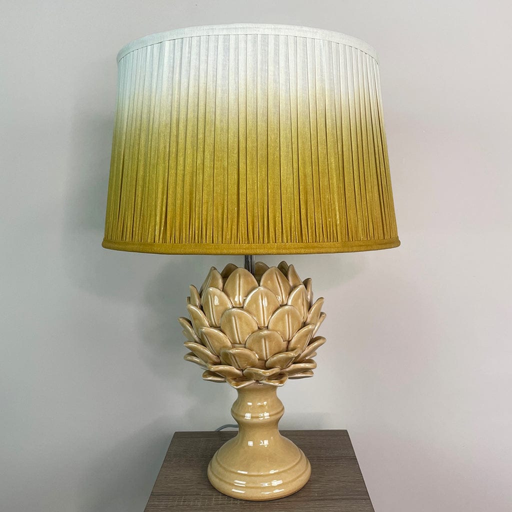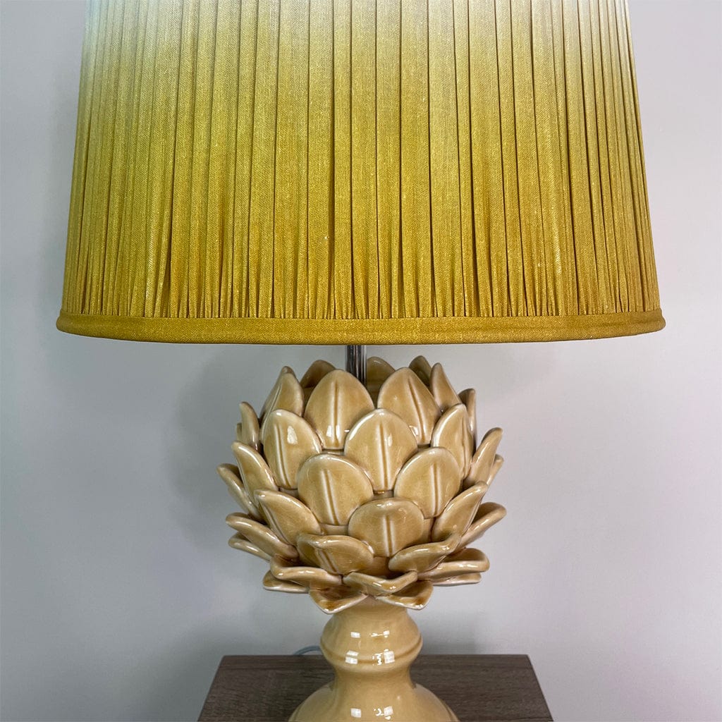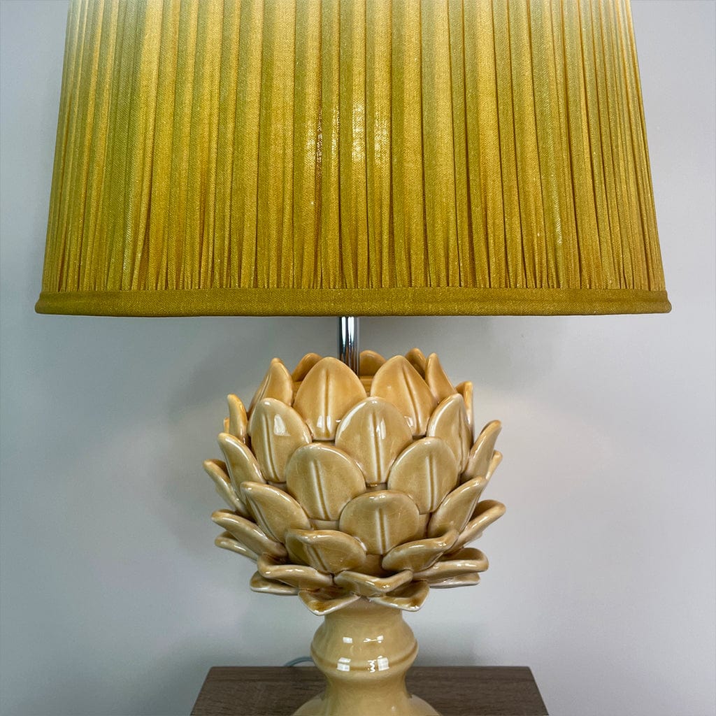 The Violetta Table Lamp brings timeless charm and artistic detail to any interior. Featuring a distressed ceramic base in antique cream with a sculptural artichoke design, this lamp is finished with a rich mustard yellow glaze for a striking, opulent effect. We've paired it with a pleated, tapered yellow lampshade to enhance the warm tones and create a bold, cheerful statement. Perfect for adding colour and character to both classic and contemporary interiors.