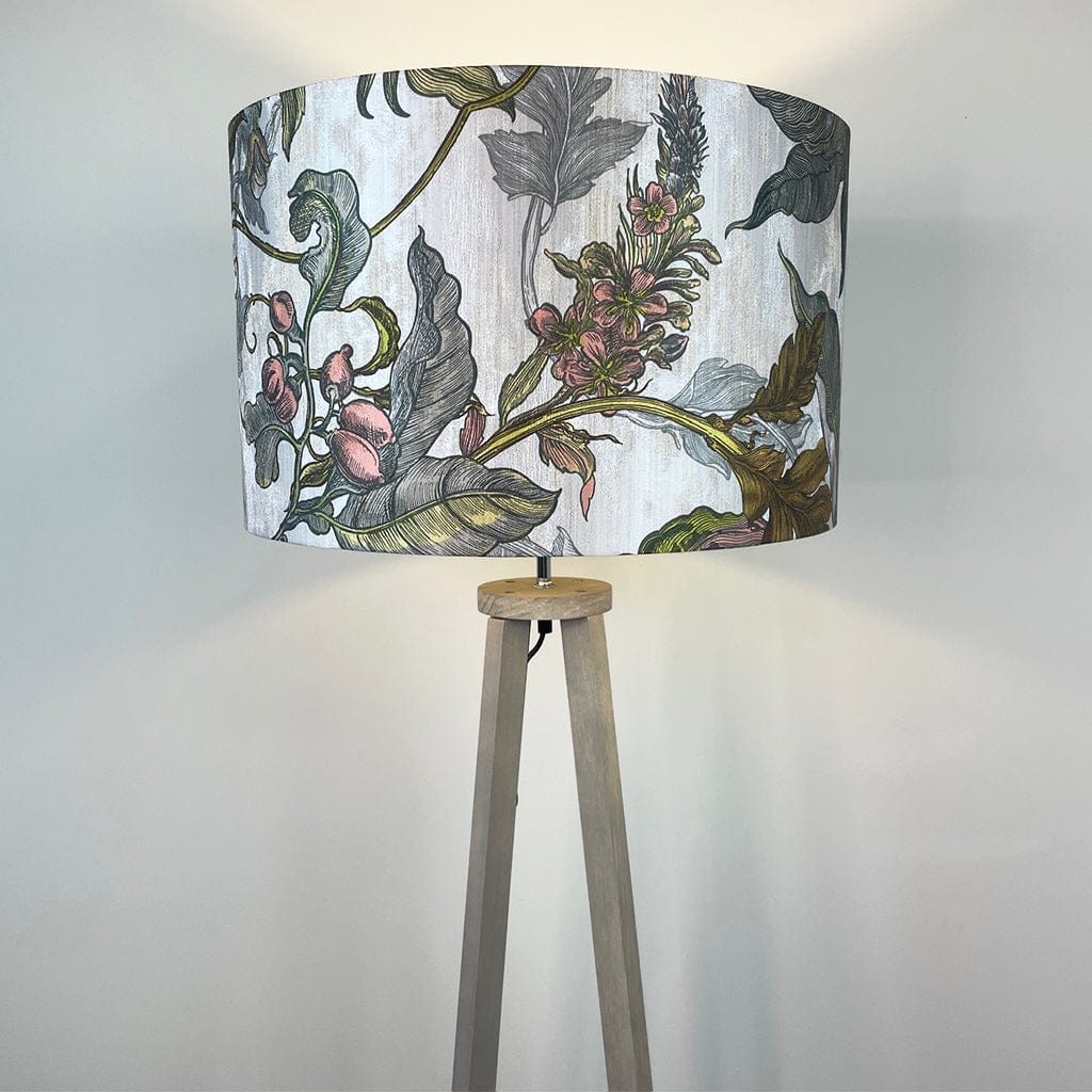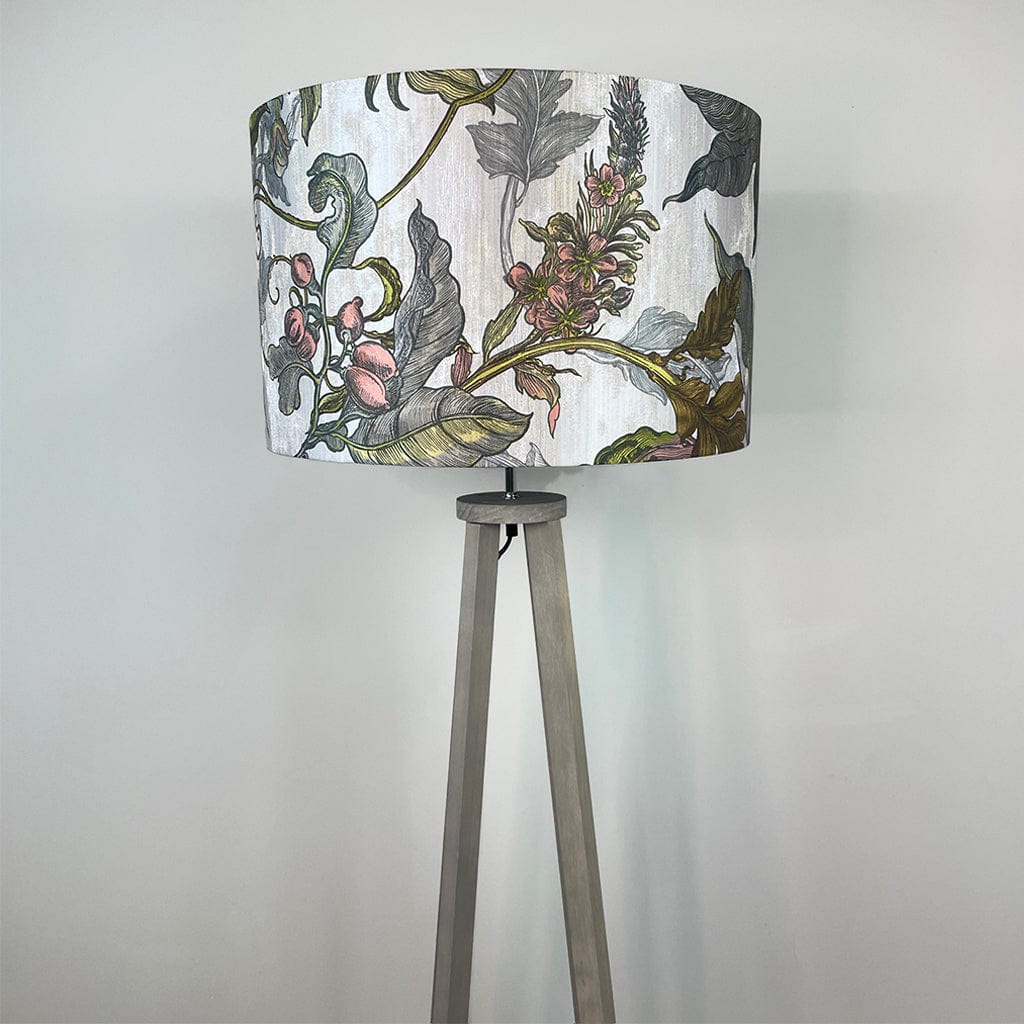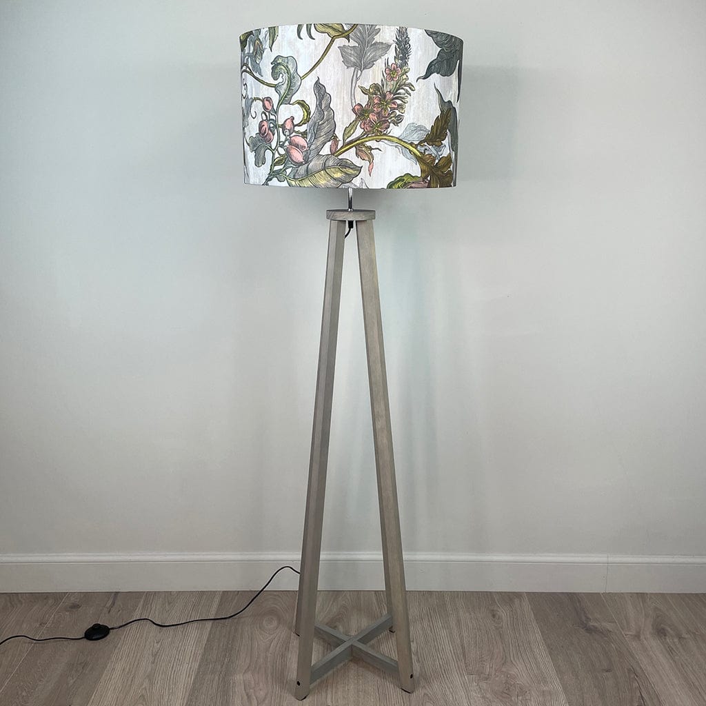 Whitby Grey Wash Wood Tapered 4 Post Floor Lamp with Timorous Beasties Epic Botanic Beige Peach Lampshade