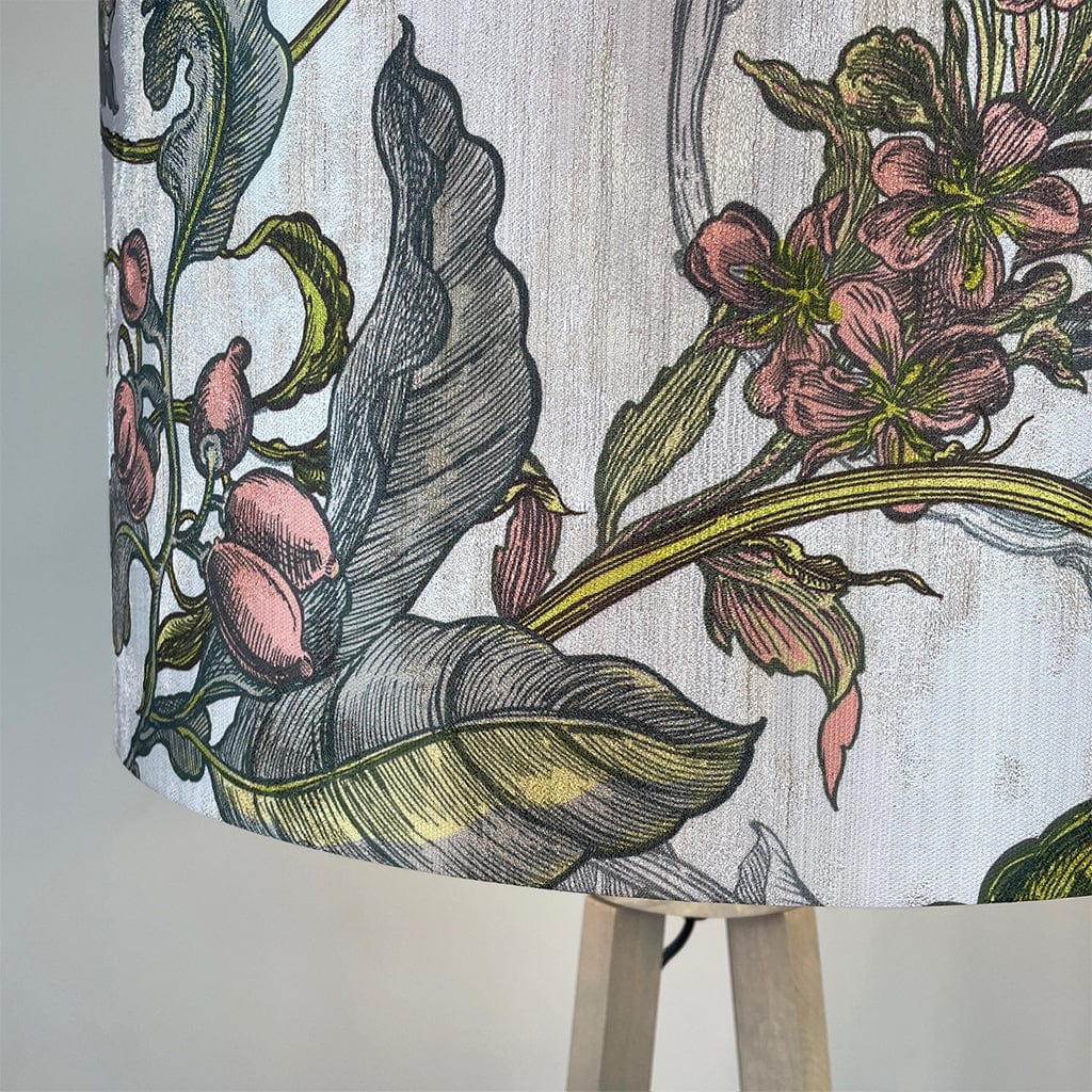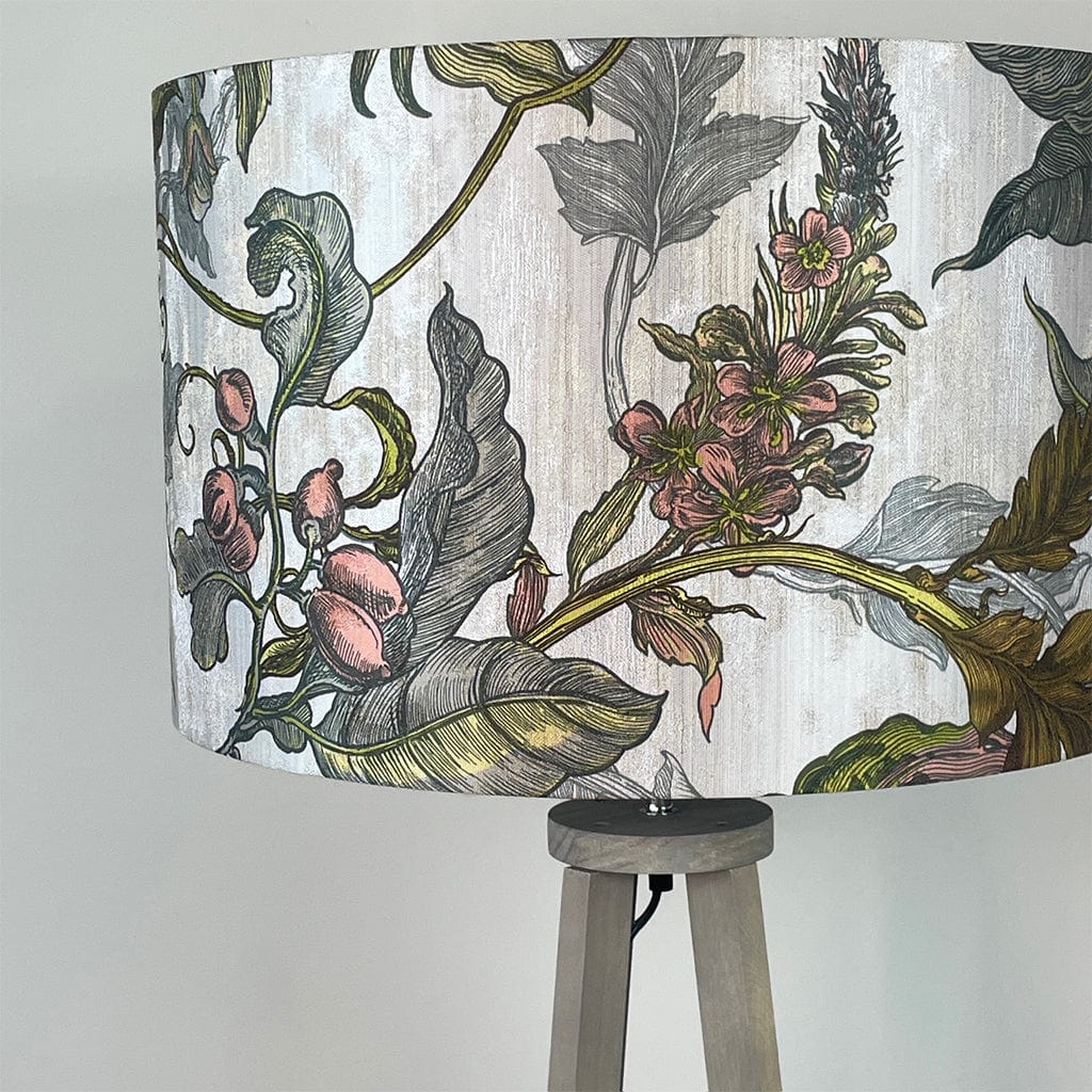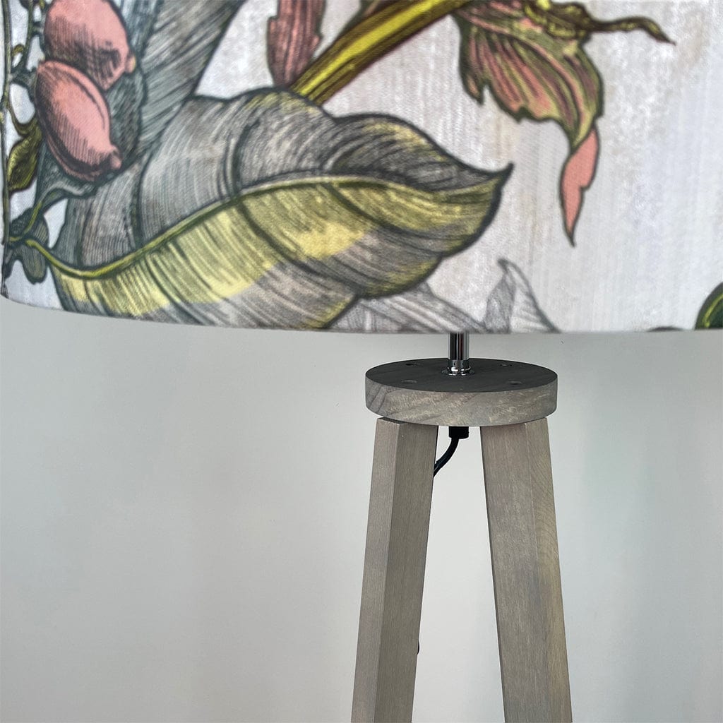 Whitby Grey Wash Wood Tapered 4 Post Floor Lamp with Timorous Beasties Epic Botanic Beige Peach Lampshade